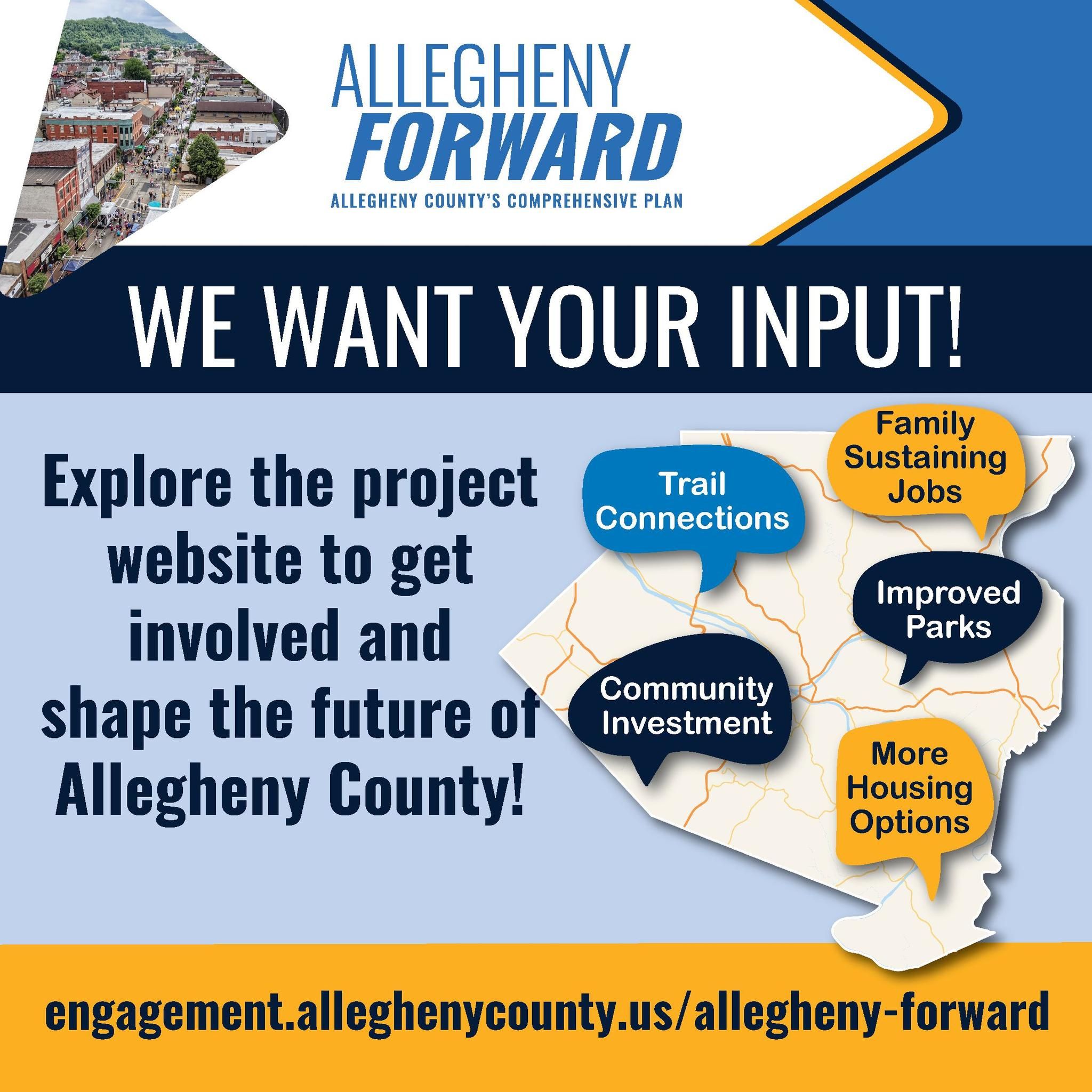 Allegheny County is developing Allegheny Forward, its comprehensive plan update to the 2008 Allegheny Places plan. It will be a blueprint to guide growth, investment, and policy decisions for the next 25 years. The plan will help shape our communities, economy, transportation systems, housing, and environment.